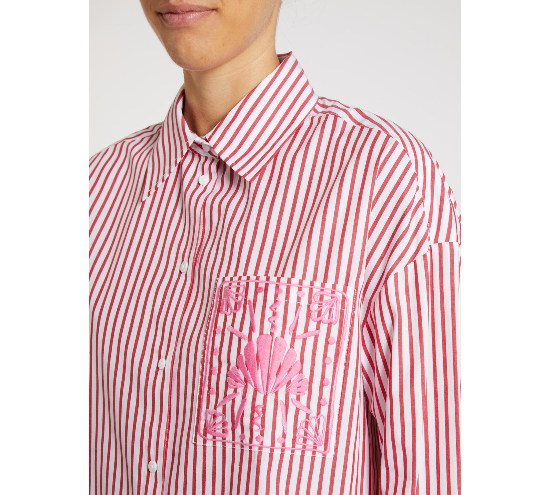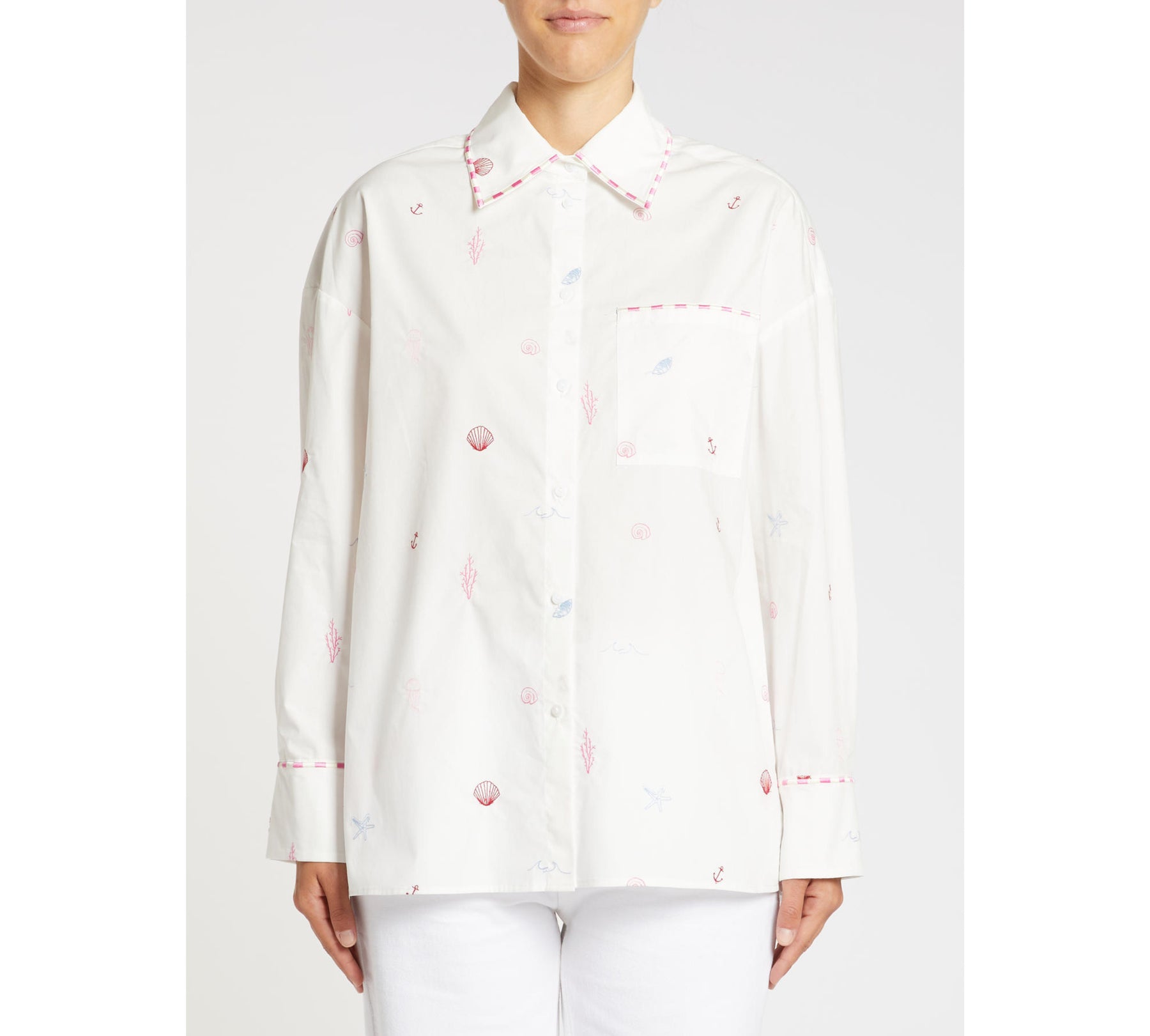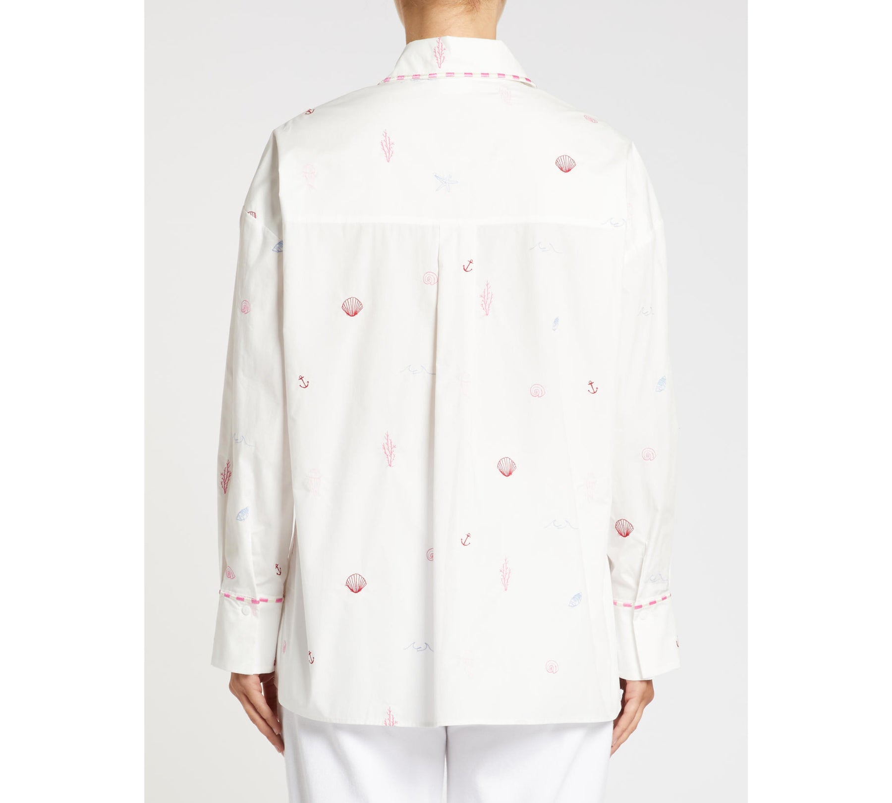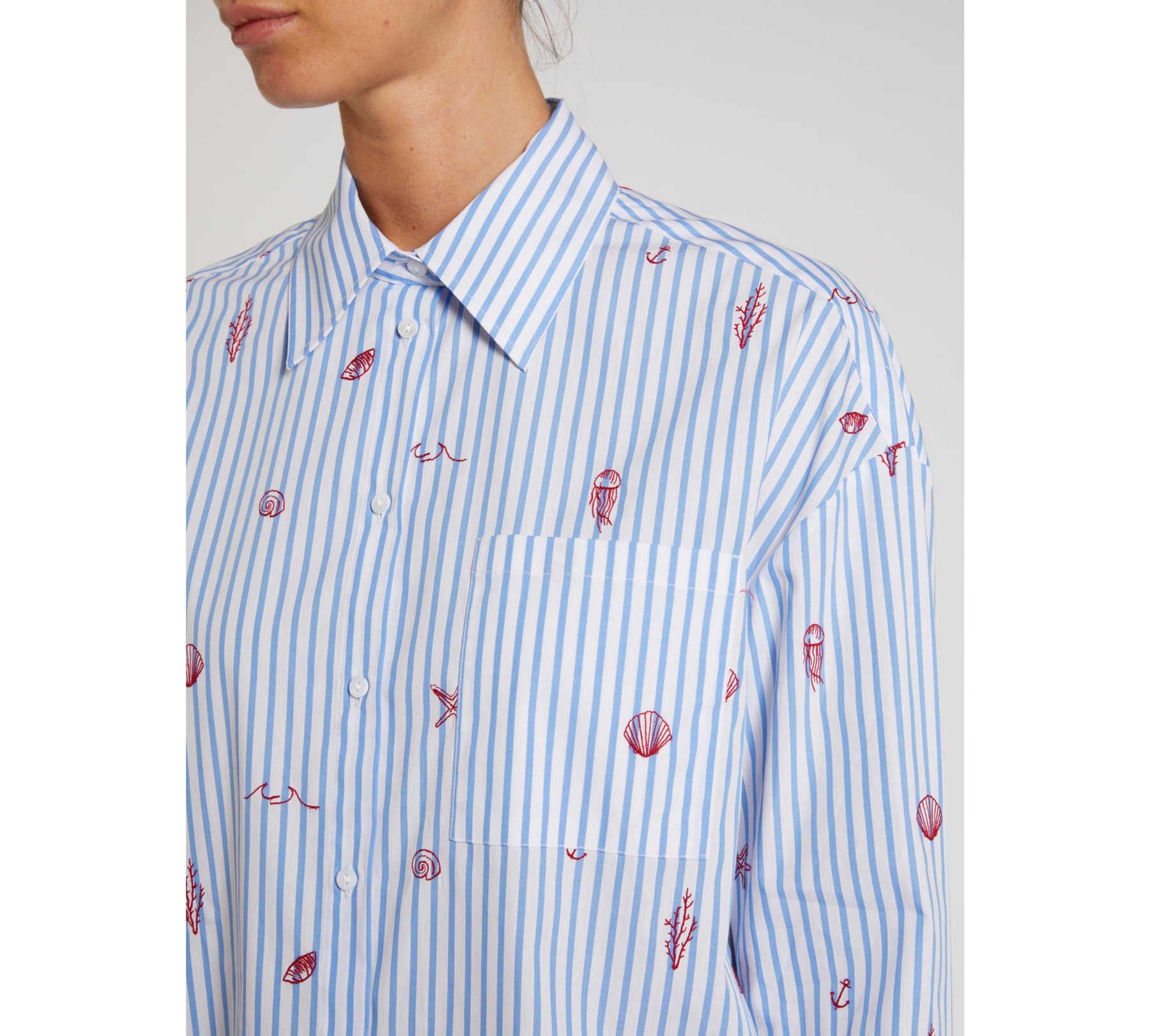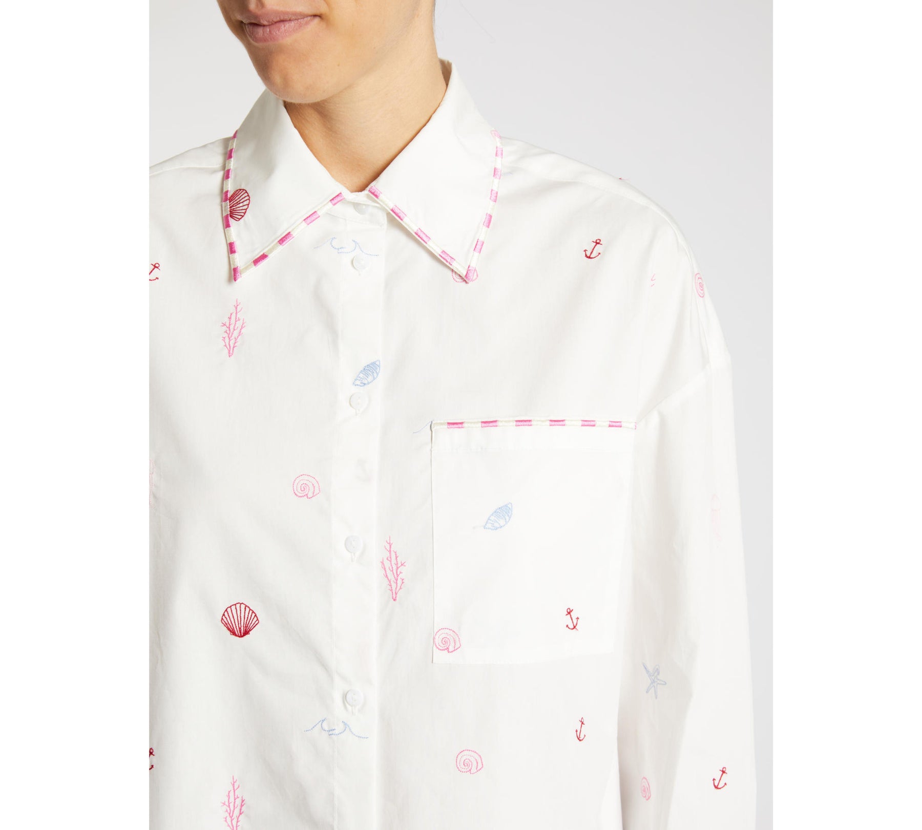 La camicia dal taglio classico d’ispirazione maschile esce dal guardaroba da città ed è pronta a partire per le vacanze. Arricchita da ricami a tema marino, fa parte della capsule I Wish You Were With Me, realizzata in collaborazione con il brand britannico di homeware Amuse la Bouche.