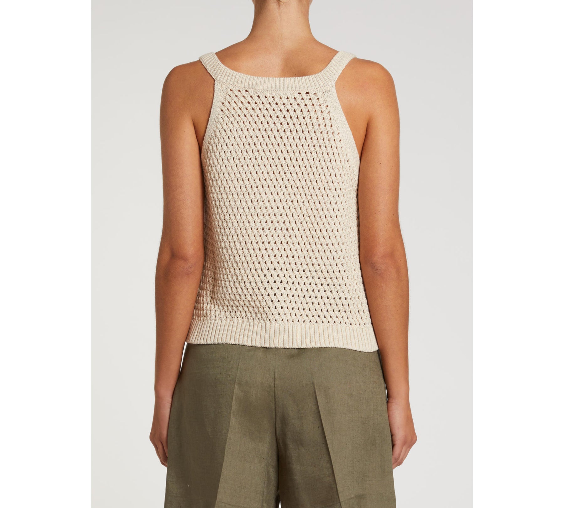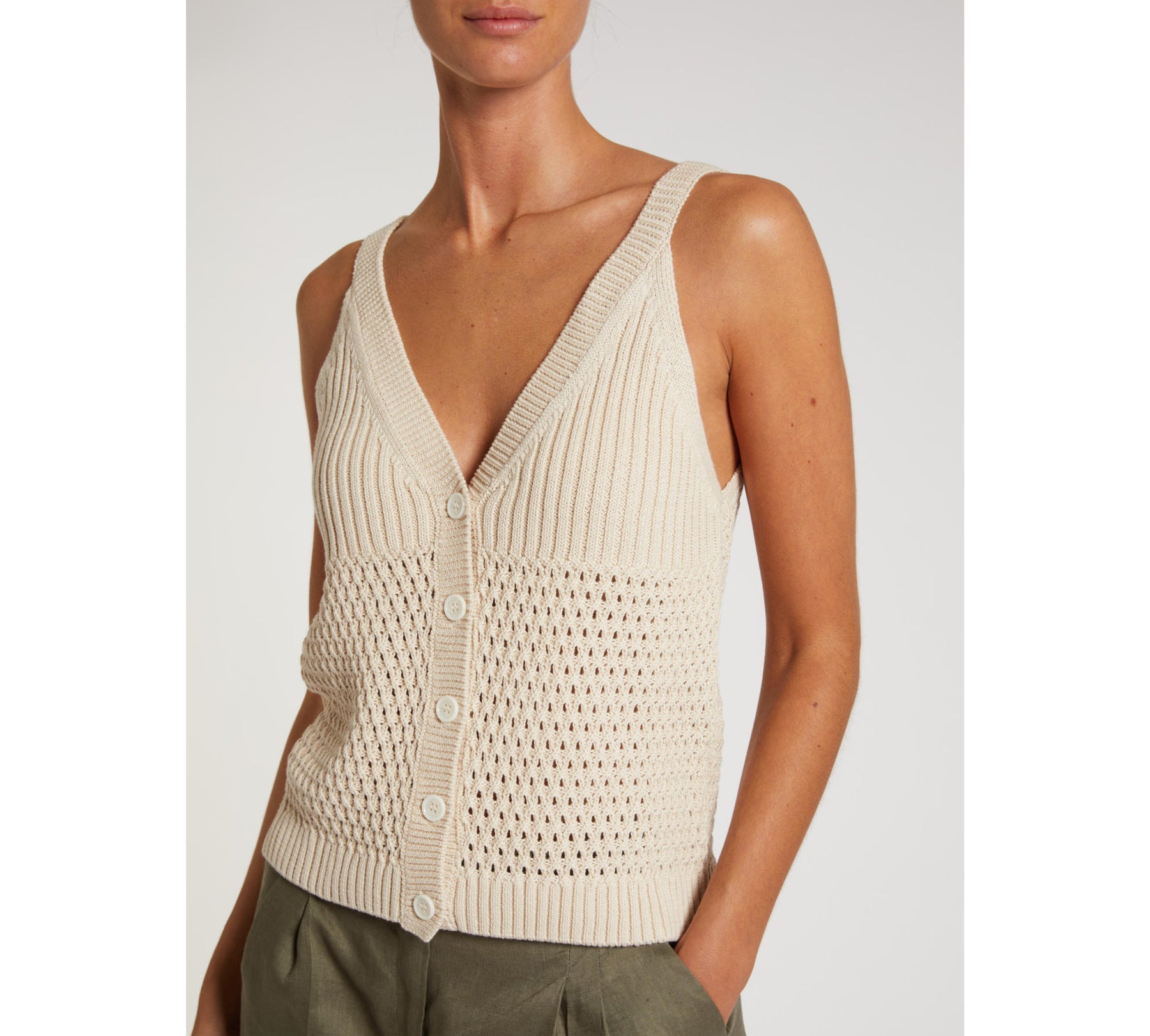 Lavorazione dal gusto handmade e proporzioni che sfiorano il corpo per questo gilet in cotone. Indossato sulla camicia, come sottogiacca o come top, sempre perfetto.
