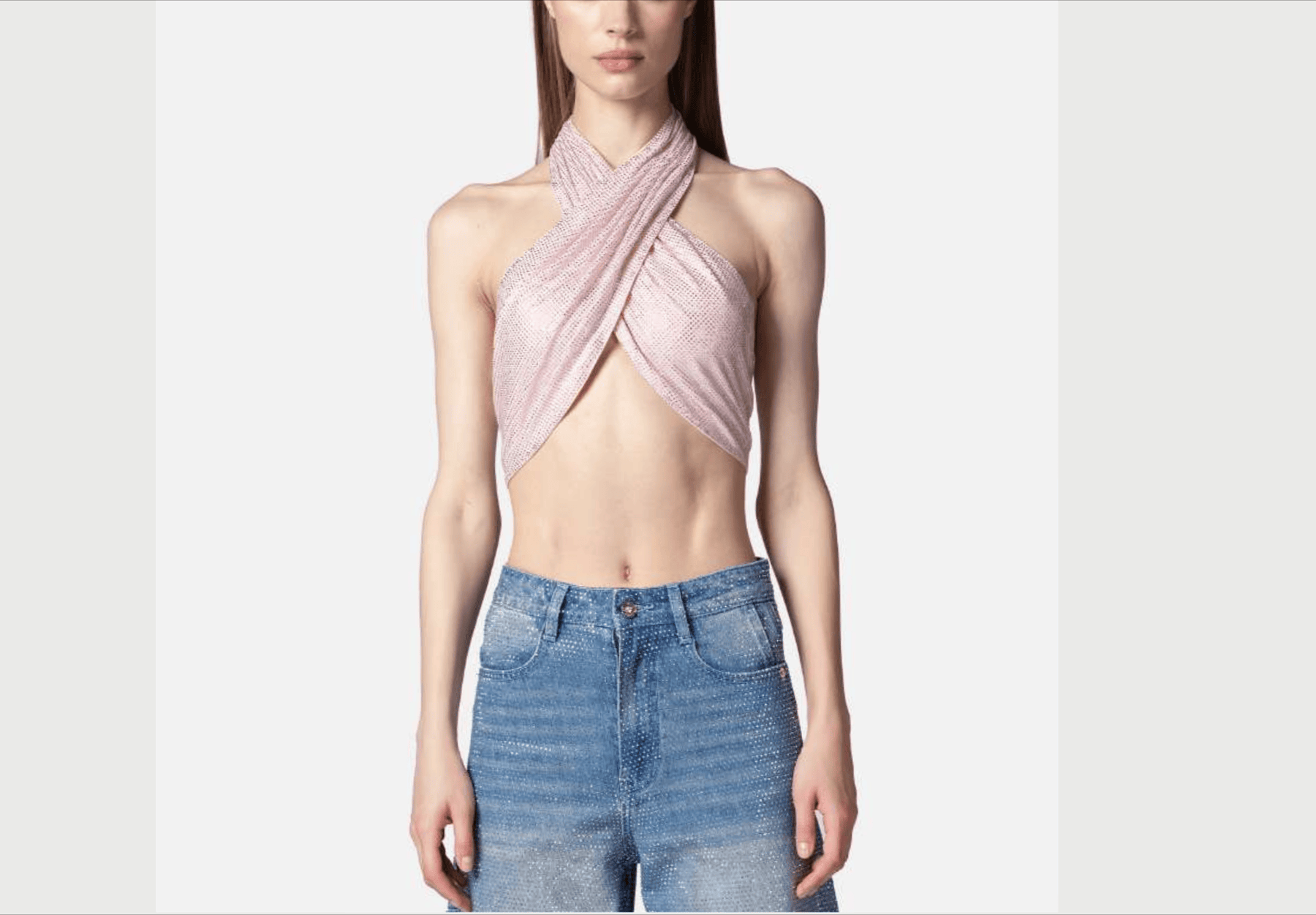DENIM BAGGY LAVAGGIO MEDIO RICOPERTO INTERAMENTE DI MICROSTRASS CRYSTAL, GAMBA AMPIA AL CENTRO E PIU’